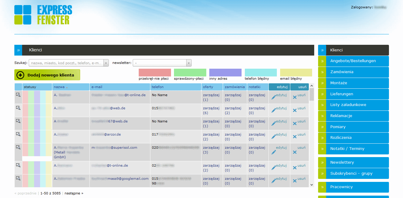 Dedykowany CRM dla niemiecko‑polskiej firmy zajmującej się sprzedażą i instalacją okien, zbudowany pod konkretny proces operacyjny. System porządkuje pełny cykl obsługi klienta: od ofertowania, przez zamówienia i logistykę, po montaże, rozliczenia oraz reklamacje – w jednym panelu dla zespołu.